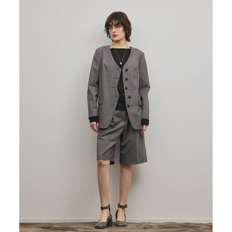 ジグザグにカッティングしたフロントのディティールがモードな雰囲気を醸し出すノーカラージャケット。 素材は細番手のオーストラリア産ファインメリノウールを 50%使用し、ポリエステル・ポリウレタンと混紡した、しなやかなふくらみ感が特徴の日本製生地を贅沢に使用。薄手に拘りながらも上質感があり、ブラックの無地の美しい微光沢も素材の良さを感じさせます。 軽さに拘り、裏地はあえて背抜きのタイプに。そして極力柔らかく作る事で、カーディガン感覚で気軽に着て頂けるように仕立てました。フロントには構築感のあるカッティングを入れ、ボタンを多く配置しアクセントにしたデザイン。前を開けてカーディガン風に羽織った時も様になるように、パターンを緻密に計算してお作りした拘りの一枚です。冬はアウターの中に入れて、暖かい時期は軽羽織りとして、ロングシーズンご活躍いただけるのも魅力。お揃いでお作りしたハーフパンツを合わせた、ワンランク上のセットアップスタイルもぜひ。