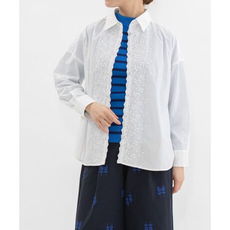 前中心にスカラップ刺繍を使用したゆったりワイドなメンズライクなシャツ。生地の片端にスカラップ刺繍を施した、オリジナル生地で仕立てました。オフホワイト、シャンブレー、ストライプの3色展開で、いずれもオフの刺繍をあしらっています。刺繍は穴のあいていない、小さなバラのようなモチーフが特徴。共くるみボタンや、開けた時にちらりと見える配色ステッチもポイントにしています。後ろが長めの前後差デザイン。衿が大きめで、フルオープンで羽織りとしても着用していただだけます。