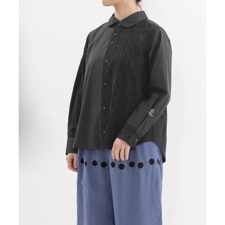 定番の丸襟シャツ。2種類の布帛づかいに、後ろ見頃は天竺素材で異素材ミックスにしています。オフホワイトとブラックはタイプライターと綿レーヨンのフラワージャガードを使ってきれいめミックス。ストライプは2種類のピッチ違いと、トップグレーの天竺の組み合わせがモード感のある仕上がりです。共くるみボタンや、開けた時にちらりと見える配色ステッチもポイントに。左袖にはシャツを英語フィンランド語仏語で表したロゴ刺繍が入っています。