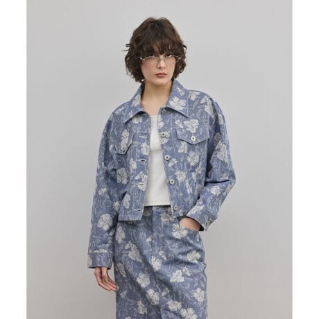 [型番:0326101328]【Japan Fabric】デニム調に見えるようにこだわったオリジナルジャガード。ショート丈のデニムジャケット。同シリーズでおつくりしたボタニカルジャガードスカート【品番:0326121328】のご用意もございます。※こちらのモデル着用画像はサンプル品を撮影しております。実際の商品と仕様、加工、サイズが若干異なる場合がございます。予めご了承くださいませ。