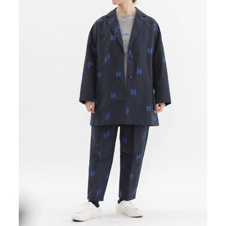 軽い綿ナイロンのグログラン生地に、ユーカリ柄の刺繍を施したオリジナル生地のセンタープレスパンツ。ペグトップシルエットのセンタープレス入りクロップドパンツで、コーディネイトにきちんと感をプラスしてくれます。両サイドのポケット口にはスカラップステッチがあり、さりげないアクセントに。ウエストはゴム仕様で、内紐つき。