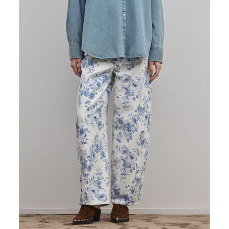 スタイリングに取り入れるだけで、一足早く春のムードを演出してくれる今季注目のバレルパンツ。 ややすっきりとした腰回りに膝周りにかけてボリュームを出した、カジュアルでありつつも程よく女性らしさを感じるシルエットがポイントです。 新しい差し色として注目のミントやアースカラーと相性の良いベージュは、加工感のある柔らかいツイル地を使用した、チノパンツ感覚で履けるデザイン。インディゴはあまり加工のない10オンスの綺麗めなデニムを使用し、配色ステッチを効かせた洗練感のあるカラー。 サックスはツイル素材にオリジナルのフラワープリントをのせたウォールペーパー調(輪郭をくっきり描かず、花柄の境界を“ほぐしたように”ぼかした)プリント 。カラーによって素材・加工が異なり、色違いで揃えたくなるアイテムに仕上げました。ショートブーツにパンツの裾をインした今年らしい着こなしや、裾をロールアップしてソックスを見せたり、ヒールを合わせたワンランク上の着こなしなど様々なコーディネートをぜひお楽しみください。