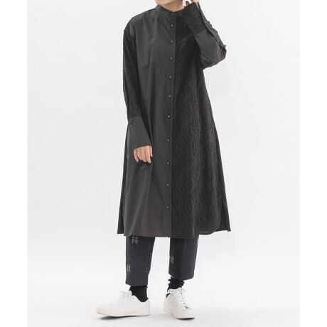 定番のスタンドカラーAラインシャツワンピースを短めにしたチュニックシャツ。凛々しいスタンドカラーと長いカフスがポイントです。2種類の布帛づかいに、後ろ見頃は天竺素材で異素材ミックスにしています。オフホワイトとブラックはタイプライターと綿レーヨンのフラワージャガードを使ってきれいめミックス。ストライプは2種類のピッチ違いと、トップグレーの天竺の組み合わせがモード感のある仕上がりです。両サイドポケットあり。