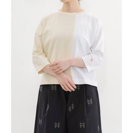 国産生地を使用したバイカラーTシャツ。程よくゆとりのある身幅に、細めの袖ですっきりとした印象に仕上げました。一枚着るだけでサマになる、7分袖のトップスで、左袖にピンクの小さなスワン刺繍がワンポイントで入っています。