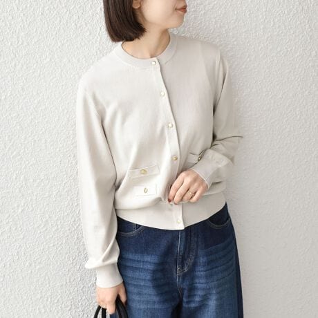 ゴールドカラーのボタンがアクセントになった上品な印象のカーディガン。