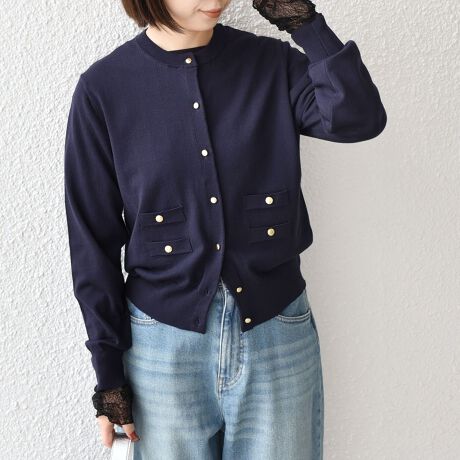 ゴールドカラーのボタンがアクセントになった上品な印象のカーディガン。