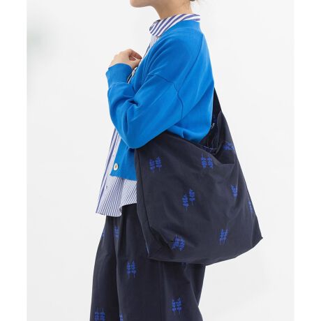 軽い綿ナイロンのグログラン生地に、ユーカリ柄の刺繍を施したオリジナル生地のショルダートートバッグ。大容量の斜めがけタイプです。メインの開きはファスナーで、持ち手も付いて運びやすい。内ポケット1カ所あり。