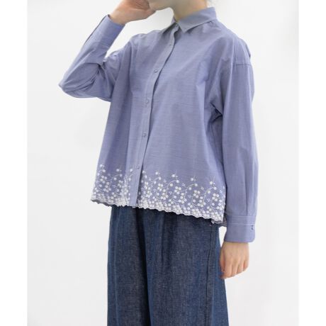 裾にスカラップ刺繍をいれたシンプルなシャツ。生地の片端にスカラップ刺繍を施した、オリジナル生地で仕立てました。オフホワイト、シャンブレー、ストライプの3色展開で、いずれもオフの刺繍をあしらっています。刺繍は穴のあいていない、小さなバラのようなモチーフが特徴。共くるみボタンや、開けた時にちらりと見える配色ステッチもポイントにしています。