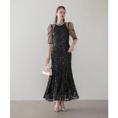 備考:ネック部分ビジュー装飾 / 全面スパンコール刺繍 / シアーパフスリーブ / マーメイドシルエット / バックファスナー仕様