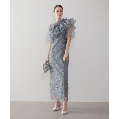 シーンに合わせてシルエットを自在に操れる3WAY仕様となっており、胸元のフリルで顔周りを華やかに見せるスタンダードスタイル、フリルを片側に寄せて洗練された印象を与えるワンショルダースタイル、さらにフリルを腰まで下げてお腹周りをカバーしつつメリハリを作るウエストペプラムスタイルと、気分に合わせた着こなしを楽しめます。全身に施されたスパンコール刺繍が光を放ち、シアーなデコルテラインとサイドスリット入りのIラインシルエットが洗練された抜け感と圧倒的なスタイルアップを両立させました。
