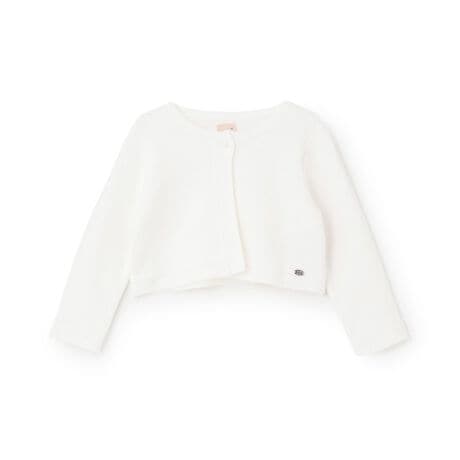 装飾を控えたシンプルなデザインのニットボレロカーディガンです。裾部分のメタルパーツやフロントボタンでアクセントを利かせました。デイリー使いはもちろん、入学式や発表会などのフォーマルシーンにもおすすめ。マシーンウォッシャブル仕様なので、ご家庭の洗濯機で簡単に洗えます。内側にお名前を記入できるタグつき。