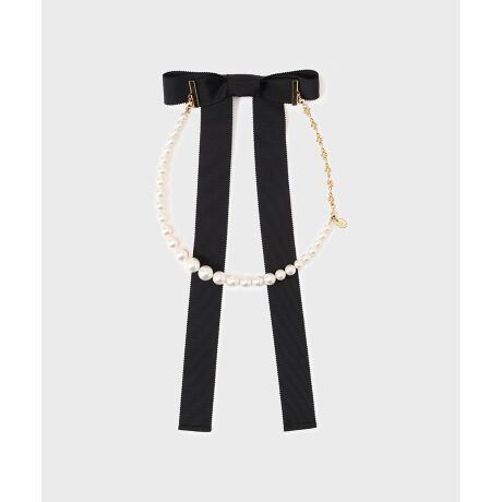 [型番:0126191506]磨きパールを連ねたバックリボンのネックレス。リボン部分はマグネットで取り外しができ、チェーンに変えても使える仕様。※こちらのモデル着用画像はサンプル品を撮影しております。実際の商品と仕様、加工、サイズが若干異なる場合がございます。予めご了承くださいませ。