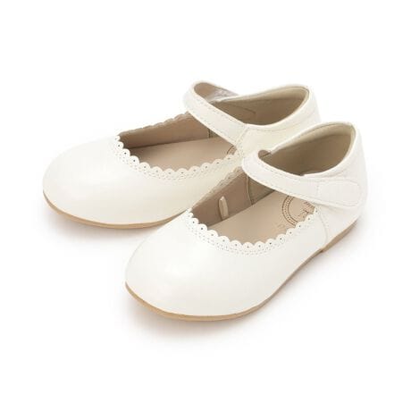 足元に上品な印象を添えるスカラップデザインのパンプスです。甲部分の波型カットがさりげなく華やかさを演出し、シンプルながら存在感のある一足。ベルト部分は面ファスナー仕様で簡単に脱ぎはきできるのもうれしいポイントです。お出掛けにはもちろん、発表会や卒業式などの特別な日にも活躍します。≪重さ≫17cm/片足約92g