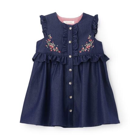 薄手のデニムに野イチゴの刺しゅうをほどこしたジャンパースカートです。長袖のカットソーやニット、半袖Tシャツなどインナーを変えることで長く着用できます。小物の収納に便利なポケットを両サイドに備えているのも魅力。内側にお名前を記入できるタグがついています。【おすすめの着用時期は春夏シーズン】