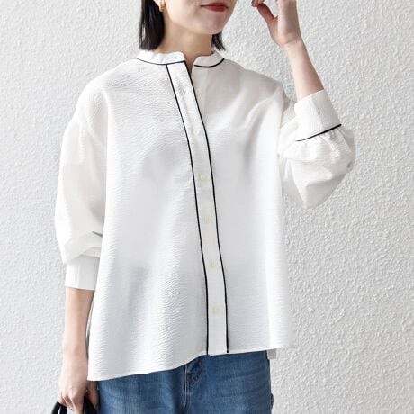 バンドカラーですっきりとした印象に、袖やヨーク下のギャザーとバックリボンで、フェミニン要素もたっぷりの一枚です。