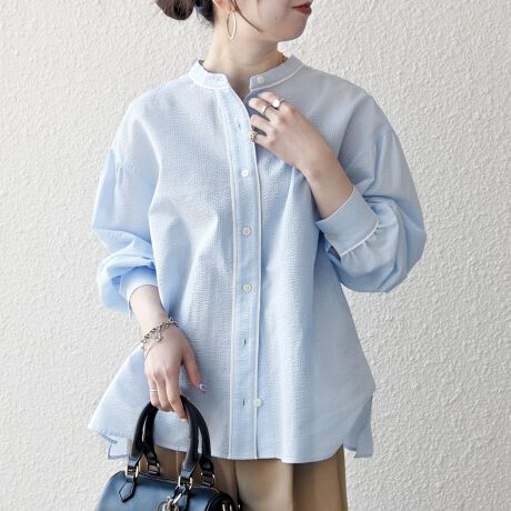 バンドカラーですっきりとした印象に、袖やヨーク下のギャザーとバックリボンで、フェミニン要素もたっぷりの一枚です。