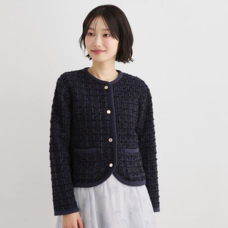 テープヤーンを使用してツイード調に編み上げたノーカラーカーディガンです。
