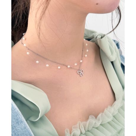 リボンモチーフがさりげなく揺れる、チェーン×パールの2連ネックレス。