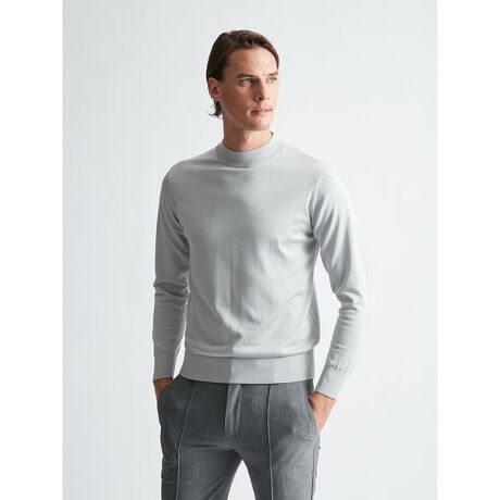 プレーティング編みという表裏の表情を変えることのできる編み方を用い、表側にはシルク、裏側には綿という構成で編み立てることで、シルクの高級感と綿の着心地をあわせもった仕上がりとなっています。