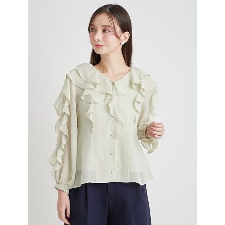 ラッフルフリルを全体にあしらったシフォンブラウス。季節問わず着て頂けるような、絶妙な透け感のある素材を使用しています。全方位どこから見てもフリルが可愛いブラウスに仕上げました。