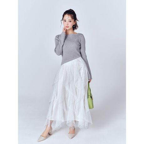 衿ぐりはすっきりとした広めのボートネックにすることで、デコルテラインを綺麗に見せてくれます。ウエストラインを斜めのアシンメトリーにし、ニュアンスのある幾何学柄に織られた繊細なチュールをふんだんに使ったラッフルデザインのスカートで華やかな印象に仕上げました。左脇コンシールで着脱可能となります。