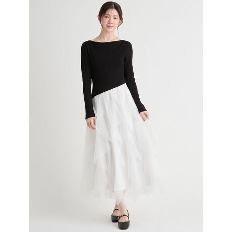 衿ぐりはすっきりとした広めのボートネックにすることで、デコルテラインを綺麗に見せてくれます。ウエストラインを斜めのアシンメトリーにし、ニュアンスのある幾何学柄に織られた繊細なチュールをふんだんに使ったラッフルデザインのスカートで華やかな印象に仕上げました。左脇コンシールで着脱可能となります。