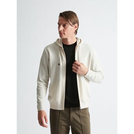 羽織りのアイテムなので、クルーネックなどのアイテムよりも裾や袖口のリブの糸の本数取りを増やし、より型崩れしにくいしっかりとした構成にしています。
