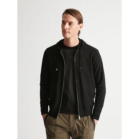 羽織りのアイテムなので、クルーネックなどのアイテムよりも裾や袖口のリブの糸の本数取りを増やし、より型崩れしにくいしっかりとした構成にしています。