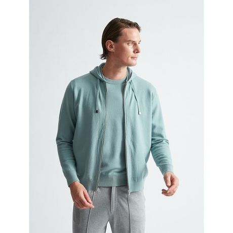 羽織りのアイテムなので、クルーネックなどのアイテムよりも裾や袖口のリブの糸の本数取りを増やし、より型崩れしにくいしっかりとした構成にしています。