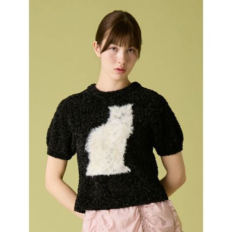 ふわふわの肌触りのキャットモチーフを施したニット。ベースにはツイーディで華やかな印象のファンシーヤーンを使用し、表情豊かに編み立てました。キャットモチーフの色合いはボディカラーごとに変え、カラーの組み合わせにこだわったデザインに仕上げました。