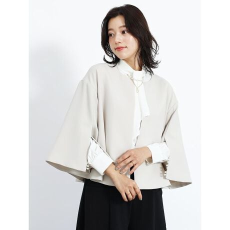 ノーカラーデザインにケープシルエットをプラスしたトレンドライクなジャケット。