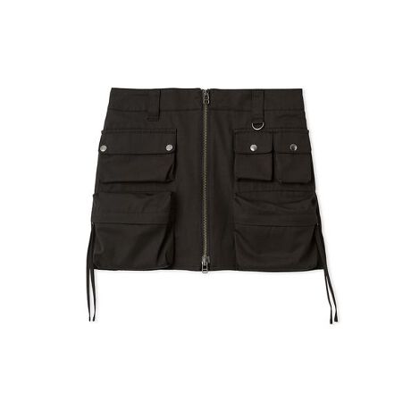 適度なハリ感のあるツイル目の素材を使用し、アシンメトリーに立体カーゴポケットをいくつも付けたデザインがポイントのミニスカート。ポケットはそれぞれ使えるので機能性も抜群です。前が逆開ファスナー仕様なので、裾を開けてパンツの上に履いてレイヤードもお楽しみいただけます。ウエストをやや落としても着用いただけるサイズ感。後ろゴムになっているので履き心地の良いアイテムになっております。
