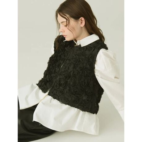 ローズモチーフが全体にあしらわれた華やかなフリルベスト。