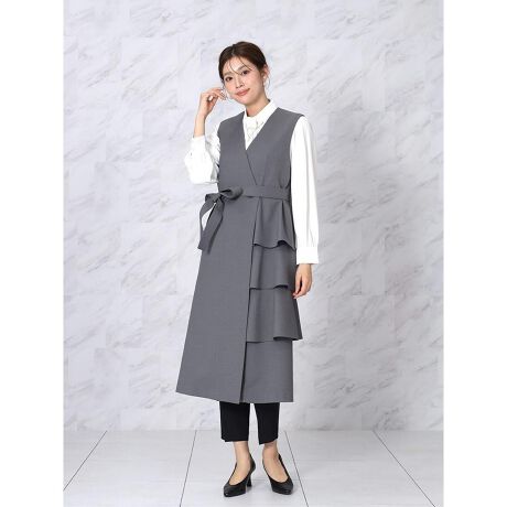 アシンメトリーなフリルがドラマティックで、女性らしさときちんと感を両立したジレワンピース。