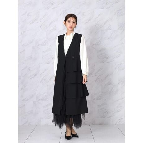 アシンメトリーなフリルがドラマティックで、女性らしさときちんと感を両立したジレワンピース。
