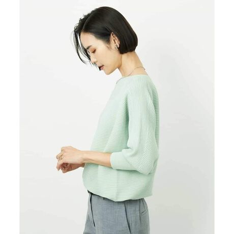 MICHEL KLEINを代表する名作ニット。 ご好評いただいている、リブを横使いしたボートネックのドルマンスリーブプルオーバーです。素材改良により、ふくらみのある風合いと美しく立つリブの畝を実現。縦方向の伸びと戻りが良く、着崩れしにくくなっています。ウエストのとまり位置は、合わせるアイテムやお好みに応じて調整でき、自然な着やせ効果も期待できます。すっきりとした衿元と、ドルマンスリーブの程よいゆとりが上品な印象を演出する一枚です。40サイズは限定店舗展開です。