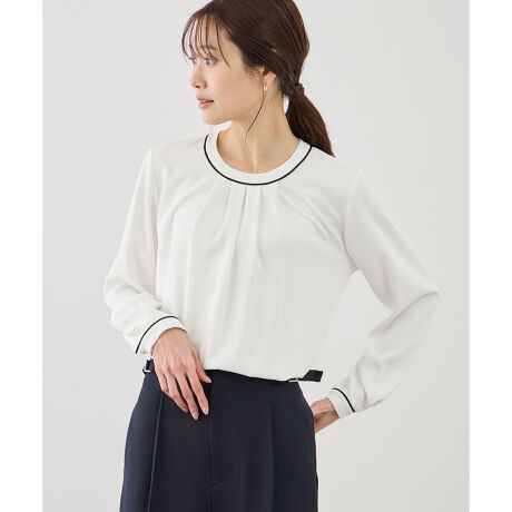 ・再生ポリエステル30%配合のポリエステル100%素材を使用し、サステナブルと上品な落ち感を両立したブラウス。