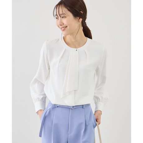 ・フロントドレープでボウタイ風に仕上げたデザインが、顔まわりを華やかに見せる長袖ブラウス。