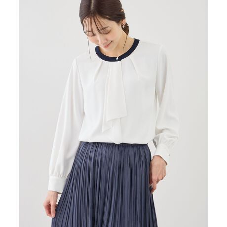 ・フロントドレープでボウタイ風に仕上げたデザインが、顔まわりを華やかに見せる長袖ブラウス。
