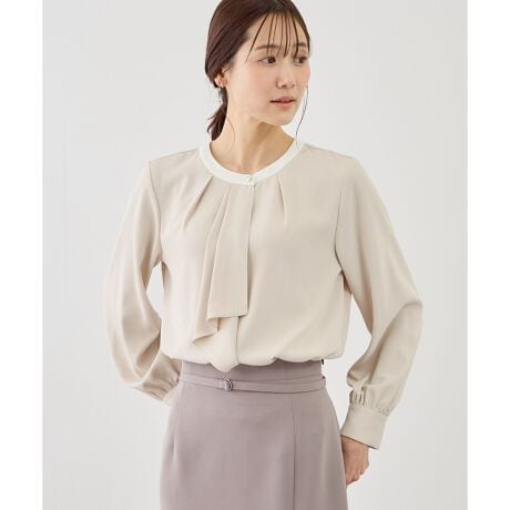 ・フロントドレープでボウタイ風に仕上げたデザインが、顔まわりを華やかに見せる長袖ブラウス。
