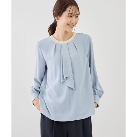 ・フロントドレープでボウタイ風に仕上げたデザインが、顔まわりを華やかに見せる長袖ブラウス。