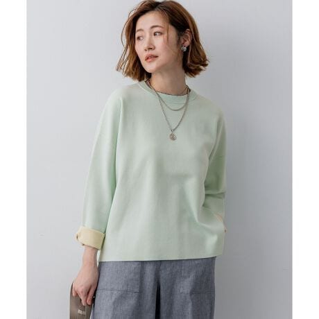 繊細な繊維を活かした、バイカラーのダブルフェイスプルオーバーです。高密度でありながら軽量で、オフボディのゆったりとしたサイズ感が特徴。前後差のあるヘムラインとサイドスリットが、着用時に美しい動きを演出し、パンツにもスカートにも合わせやすいデザインに仕上げました。高密度で繊細な表面感は肌触りも良く、長い期間ご愛用いただけます。袖口を折り返すと裏面の配色がアクセントになり、一枚で着映えするキレイ目カジュアルスタイルを叶えます。 カラーは、温かみのあるベージュに顔周りを明るく見せるイエローを組み合わせたベージュ×イエロー(#033)、肌なじみの良いアプリコットと上品なベージュで優しく柔らかな印象のアプリコット×ベージュ(#012)、爽やかなアイスグリーンにまろやかなクリームが上品さを添えるアイスグリーン×クリーム(#063)、知的なネイビーに軽やかなサックスブルーが映える洗練された配色のネイビー×サックス(#075)の4色展開です。