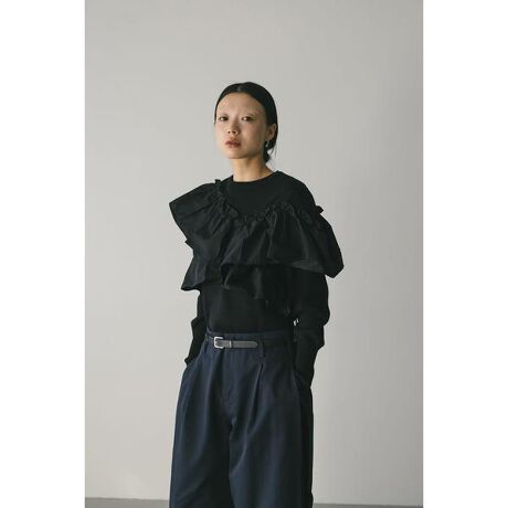 [型番:500JSB70-0111]モデル身長172cm(FREEサイズ着用)異素材のコンビネーションが華やかなフリルニットトップ。程よく張りのある布帛素材のフリルがモードな印象に導きます。インでもアウトでも着れるサイズ感がポイント。透け感なし、ストレッチあり。【お手入れ方法】手洗い可