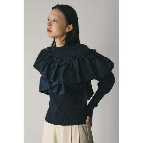 [型番:500JSB70-0111]モデル身長172cm(FREEサイズ着用)異素材のコンビネーションが華やかなフリルニットトップ。程よく張りのある布帛素材のフリルがモードな印象に導きます。インでもアウトでも着れるサイズ感がポイント。透け感なし、ストレッチあり。【お手入れ方法】手洗い可