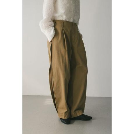 モデル身長172cm(Mサイズ着用)サイドに深いタックを入れたフォルムパンツ。コットンチノ素材を使用したローウエストデザインでルーズなシルエットがポイント。シルエットで新しさを出したスタミキらしいボトムです。透け感なし、ストレッチなし。【お手入れ方法】マシンウォッシュ可