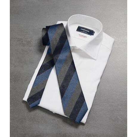 ムリネ糸ならではの表情豊かな色合いが印象的な、ストライプ柄のネクタイ。落ち着いたグレーとの配色が、Vゾーンにさりげない洒落感をプラスし、ビジネスシーンを上品に引き締めます。