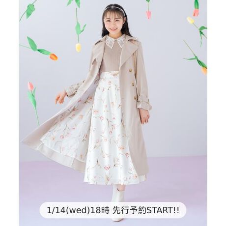 ベーシックなトレンチコートに今っぽデザインを取り入れた最旬アウターが登場♪【Design】・動くたびに美しく広がる、ワンピースのようなフレアシルエットのトレンチコート。・裏地にはオリジナルプリントを施しており、見えないところまでこだわりをプラス。・ボタンや袖口のベルトには上品なべっ甲柄パーツを使用し、上品な雰囲気を添えるアクセントに。・袖口ベルトでフレア感を調整でき、シルエットの変化も楽しめます。・柔らかい生地で、軽やかで着心地の良さも魅力。・きれいめコーデにも合わせやすく、デイリーからちょっとしたお出かけまで幅広く活躍する万能アウターです◎・同柄を使用した【リボンショルダーチューリップフレアワンピース(品番:20082615100025)】【チューリッププリントタックフレアスカート(品番:20082612100026)】もおすすめ♪【Fabic】・上質感のある、シワになりにくいポリエステル素材を使用。・エクリュ、ベージュ、ピンク、ミントの4色展開となります。【Care】ドライクリーニング