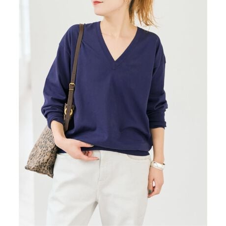 ややゆったりとしたサイジングに、深めのVネックが抜け感をプラス。