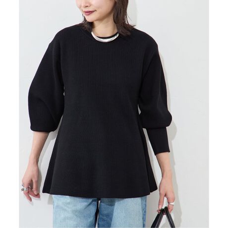 計算された立体的な編み地が、女性らしいメリハリのあるラインを描くペプラムニット。