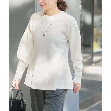 計算された立体的な編み地が、女性らしいメリハリのあるラインを描くペプラムニット。